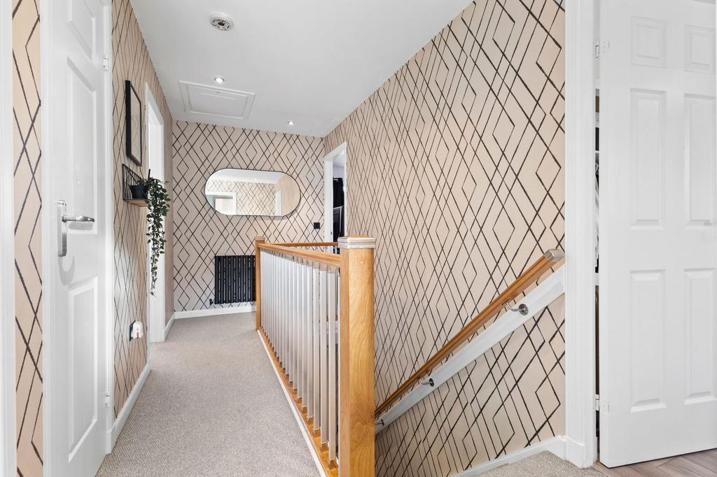 Ascending to the first floor, a bright landing provides access to four well-proportioned bedrooms. The master bedroom enjoys the luxury of an en-suite shower room with contemporary fittings including shower cubicle, wash basin, and WC. Three further bedrooms offer excellent accommodation for family members or guests. The modern family bathroom features a three-piece suite with bath, mixer shower over, wash basin, and WC. Both bathroom and en-suite benefit from stylish wet wall claddings for easy maintenance.