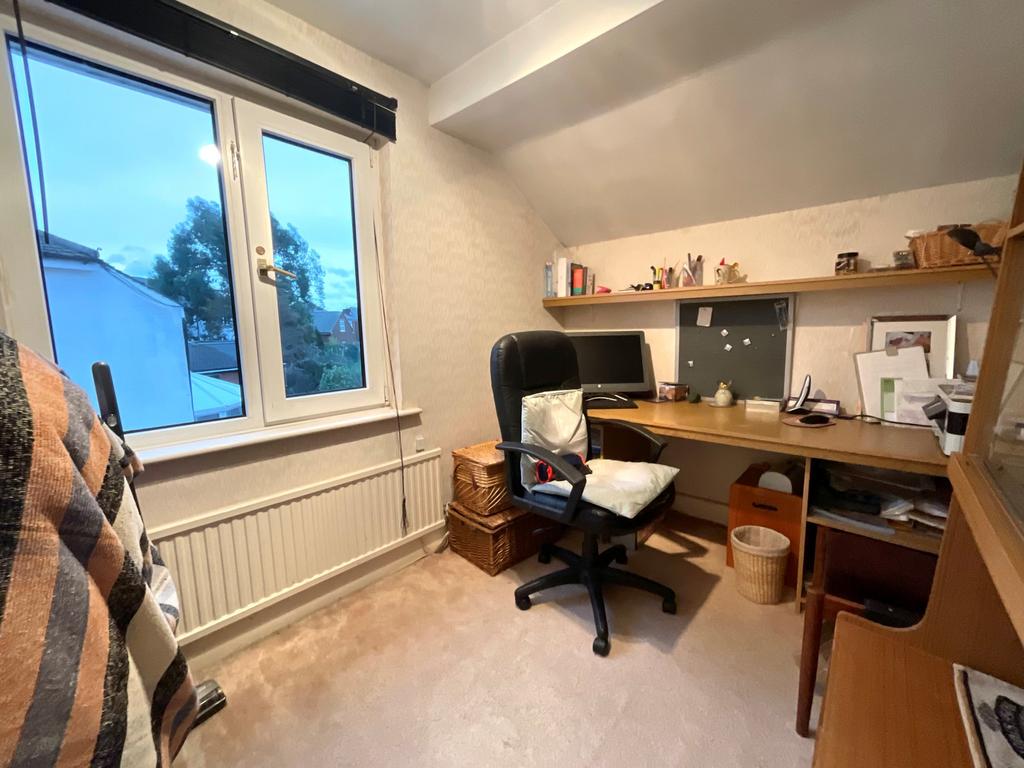 To the first floor, the property offers three double bedrooms. The smallest is currently utilised as a home office/study, making it perfect for modern living. The second bedroom is a generously sized double with fitted wardrobes, while the main bedroom also benefits from fitted wardrobes and an integrated dressing table area.