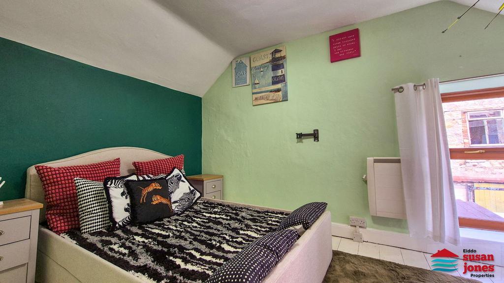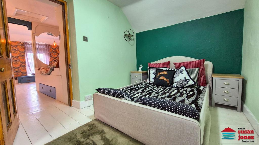 Built-in storage cupboard above stairs. Exposed floorboards, built-in storage areas. Fixed feature bed with lights and sockets. uPVC double glazed window overlooking river, Lime Street and Yr Eifl beyond. Door to: