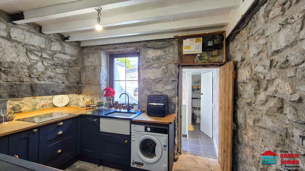 Range of modern base and wall units. Built-in electric cooker and hob. Exposed stone work and a tiled floor. uPVC double glazed window.