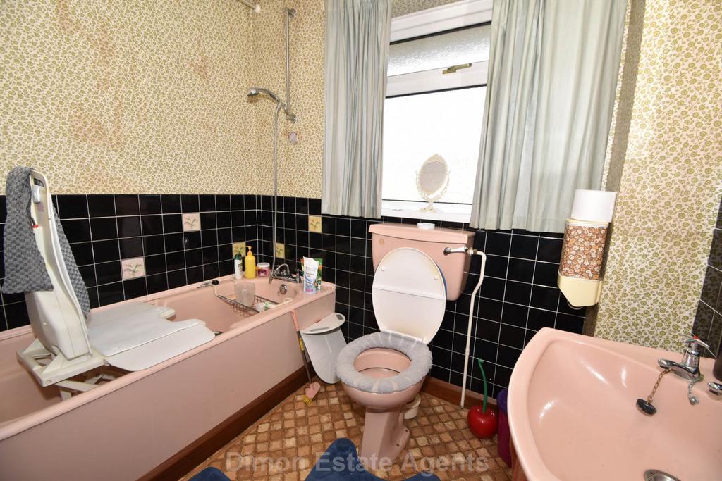 Bath with mixer tap and shower attachment, pedestal hand basin, W.C., PVCu double glazed window, tiled splashbacks, radiator.
