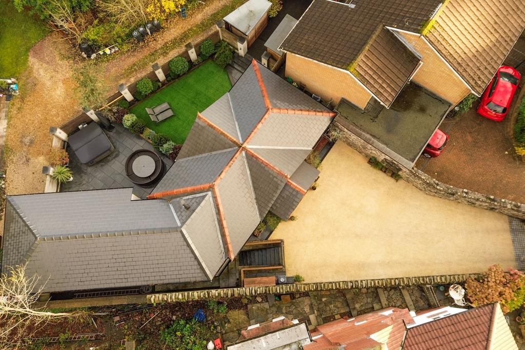 Externally, the rear garden has been beautifully landscaped to create an inviting and versatile outdoor space. A large patio provides the perfect setting for alfresco dining and entertaining, while the lawn is bordered by decorative plants and shrubs. Feature lighting enhances the space during the evening, and useful storage areas are neatly integrated into the garden design. The expansive driveway at the front of the property provides ample off-road parking for multiple vehicles.