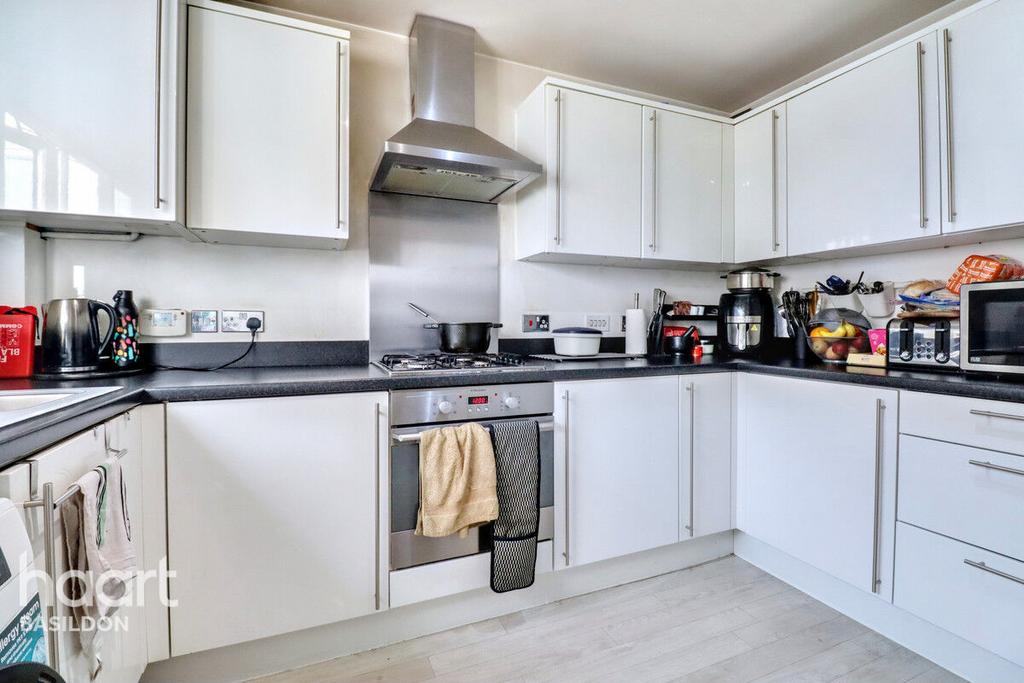 Wooden style flooring, double glazed window front aspect, wall and base units, gas hob + extractor, sink drainer with mixer taps, space for washing machine.