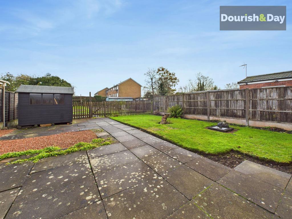 Good size rear garden with a patio seating area, generous lawn area, plants and shrubs, side access gate.