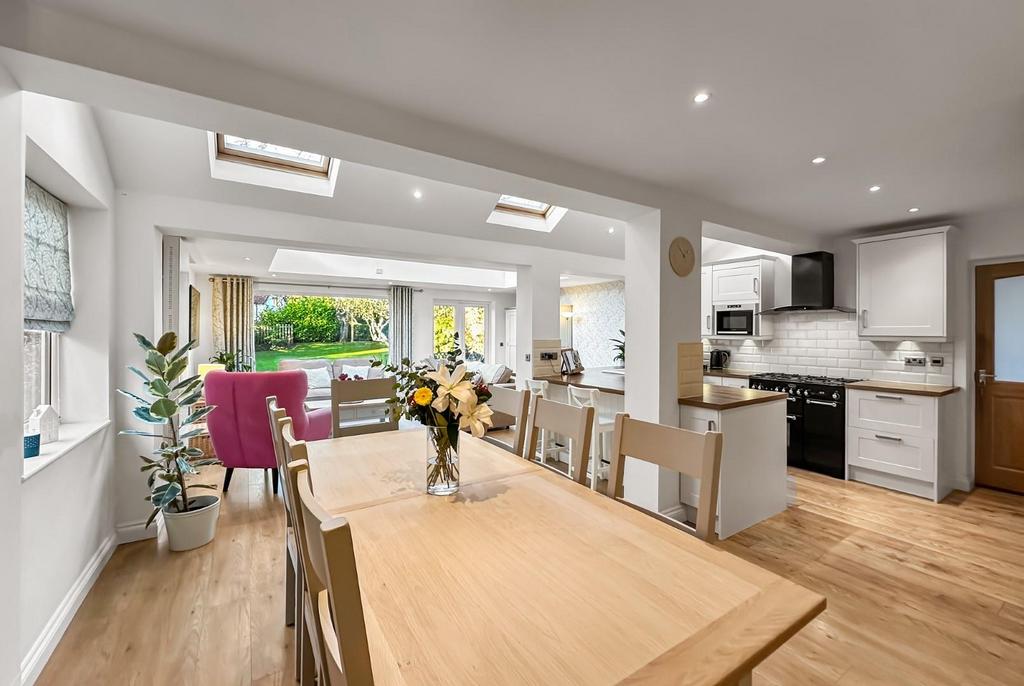 A traditional double fronted detached family house substantially extended to create much sought after open plan living space and set within landscaped grounds. The exceptionally well presented accommodation briefly comprises wide entrance hall, spacious sitting room with feature fireplace, superb living/dining kitchen with French windows to the paved rear terrace, utility room, study, cloakroom/WC, primary bedroom with fitted wardrobes, two further double bedrooms and modern bathroom/WC. Gas fired central heating and PVCu double glazing. Block paved driveway providing ample parking. Ideal location less than a mile from the village centre.