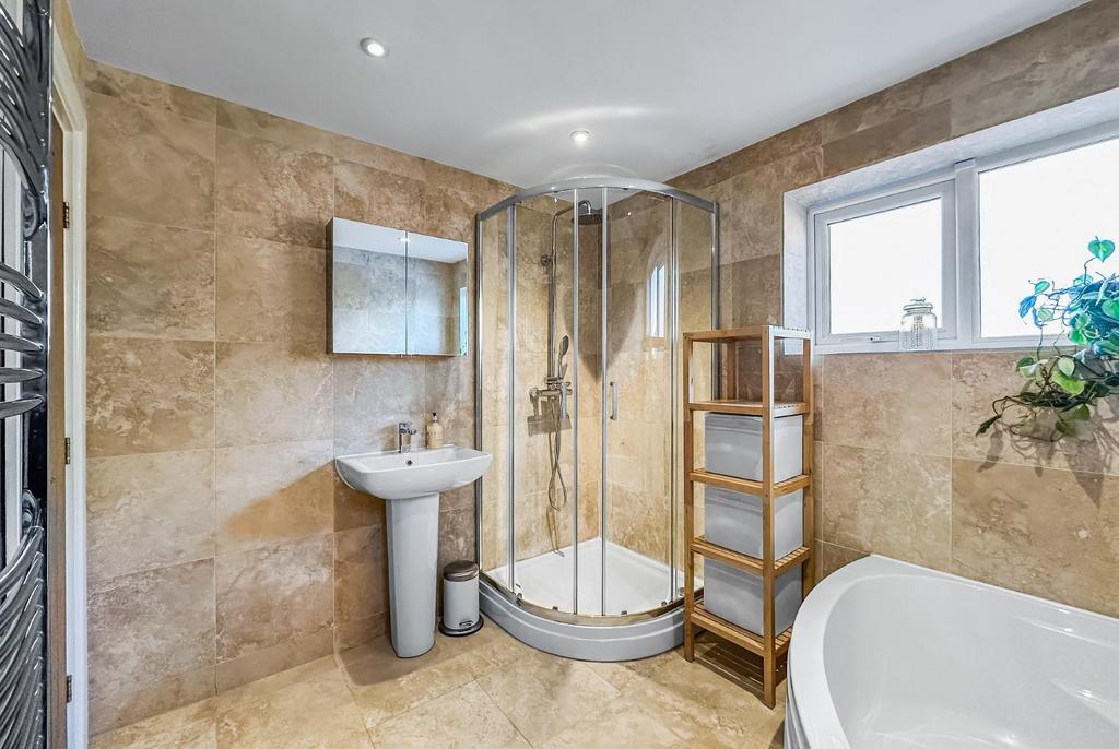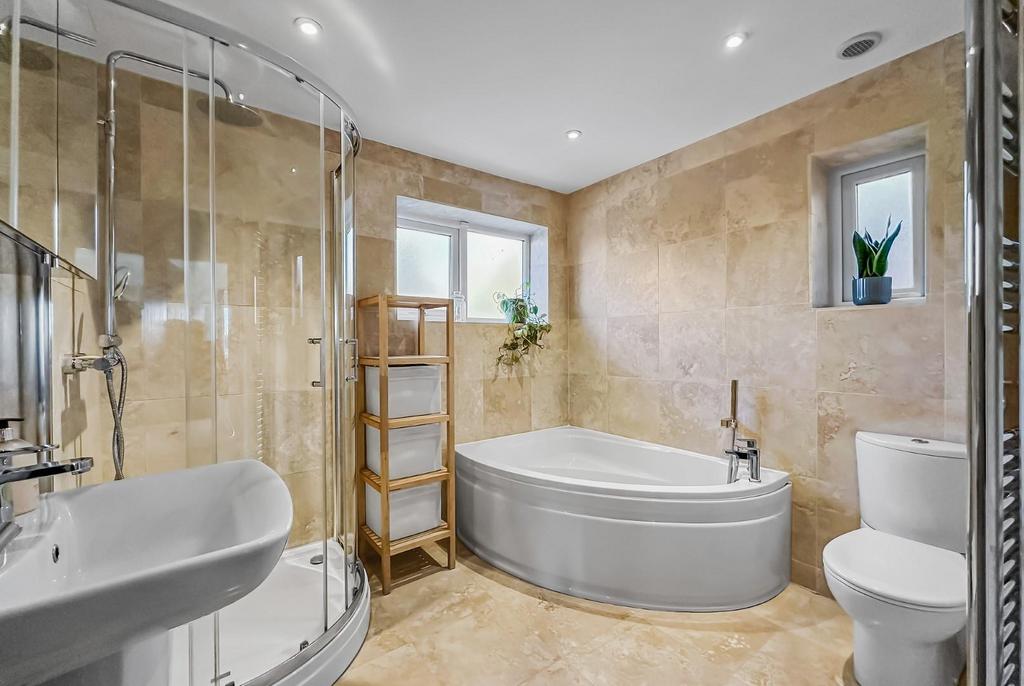 Bathroom/Wc - 2.57m x 2.26m (8'5" x 7'5") - Fully tiled and fitted with a white/chrome suite comprising panelled corner bath with mixer/shower tap, pedestal wash basin with mixer tap and low-level WC. Corner tiled shower enclosure with thermostatic rain shower plus handheld attachment. Mirror fronted cabinet. Opaque PVCu double glazed windows to the side and rear. Recessed LED lighting. Electric underfloor heating. Chrome heated towel rail.