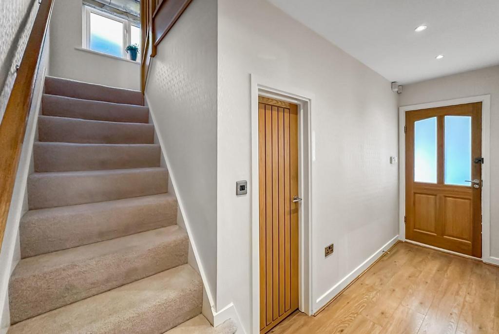 Entrance Hall - Staircase to the first floor. Laminate wood flooring. Recessed LED lighting. Radiator.