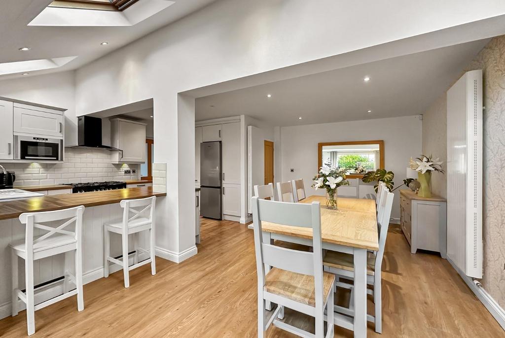 Dining Kitchen - Fitted with Shaker style wall and base units beneath wood effect heat resistant work-surfaces and inset 1½ bowl ceramic drainer sink with mixer tap and tiled splash-back. Matching breakfast bar. Recess for a wide range cooker with chimney cooker hood above. Integrated microwave and dishwasher. Recess for a fridge/freezer. Ample space for a dining suite. PVCu double glazed window to the side. Three double glazed velux windows. Laminate wood flooring. Recessed LED lighting. Two vertical radiators.
