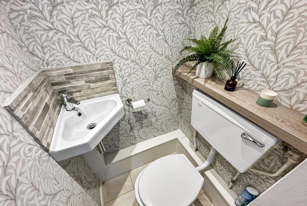 Cloakroom/Wc - White/chrome wall mounted corner wash basin and low-level WC. Tiled floor. Automated recessed LED lighting. Extractor fan.