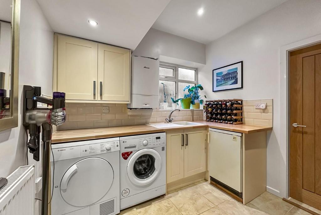 Utility/Boot Room - 2.67m x 2.41m (8'9" x 7'11") - Shaker style wall and base units beneath wood effect heat resistant work-surfaces and inset composite drainer sink with mixer tap and tiled splash-back. Recess for an automatic washing machine. tumble dryer and freezer. Cloaks area with space for hanging coats and jackets. Wall mounted gas central heating boiler. Opaque PVCu double glazed window to the side. Tiled floor. Recessed LED lighting. Radiator.