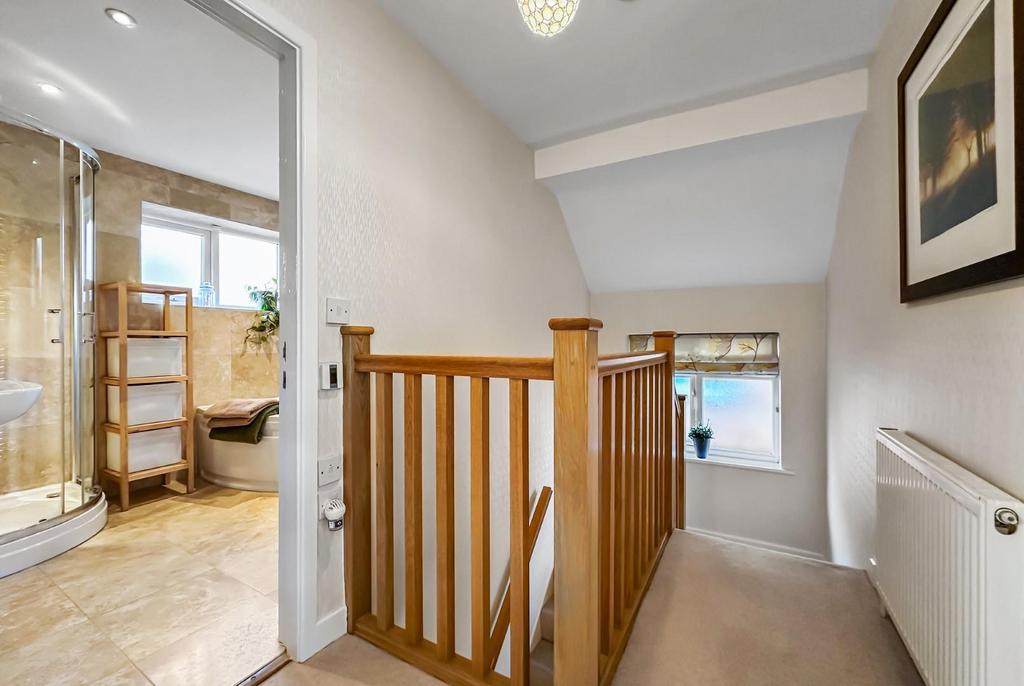 Landing - Opaque PVCu double glazed window at half landing level. Oak spindle balustrade. Access to the fully boarded loft space via a folding ladder.