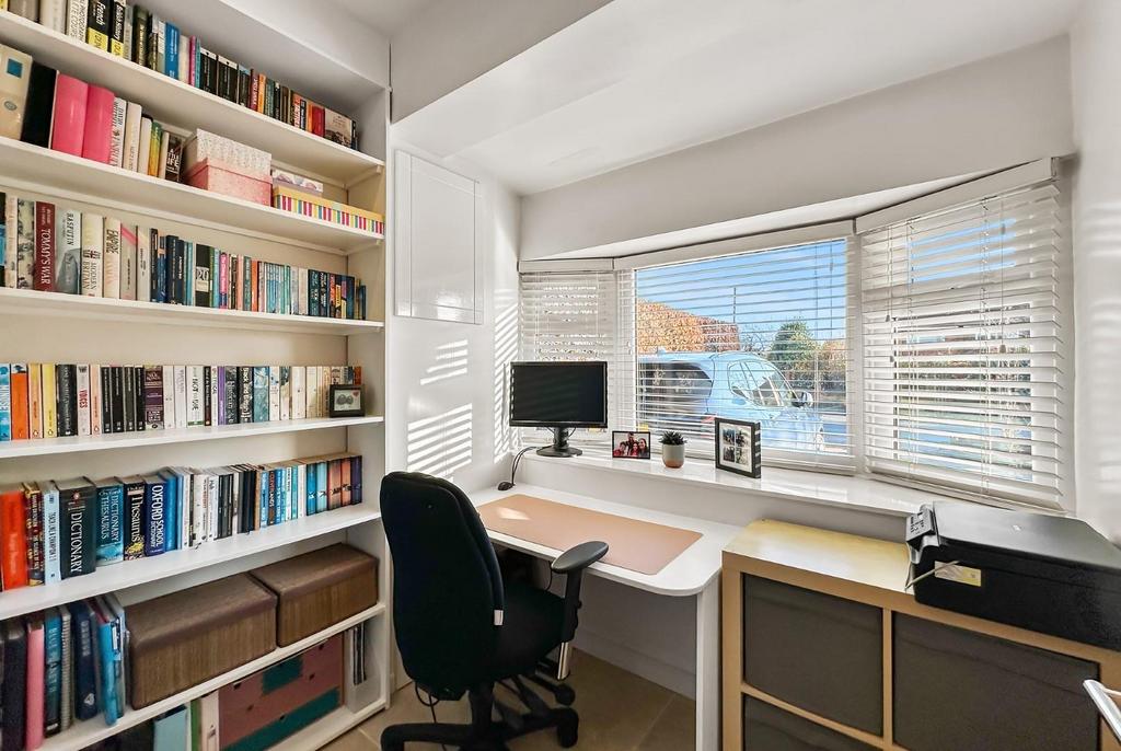 Study - 2.29m x 2.29m (7'6" x 7'6") - Fitted desk and bookshelves. PVCu double glazed oriel bay window. Tiled floor. Recessed LED lighting.