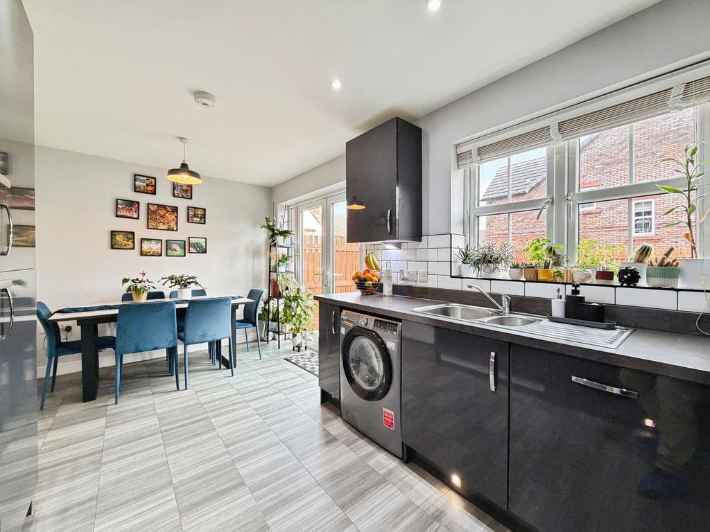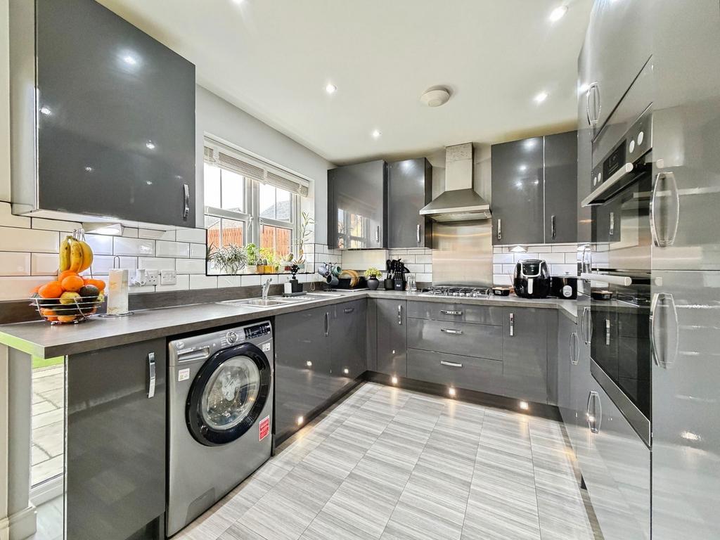 The real heart of this wonderful home lies to the rear, where the impressive dining kitchen creates a sociable and stylish space perfect for both everyday living and entertaining. Fitted with sleek contemporary high-gloss grey units, enhanced by LED under-unit and plinth lighting, the kitchen combines visual impact with intelligent design.