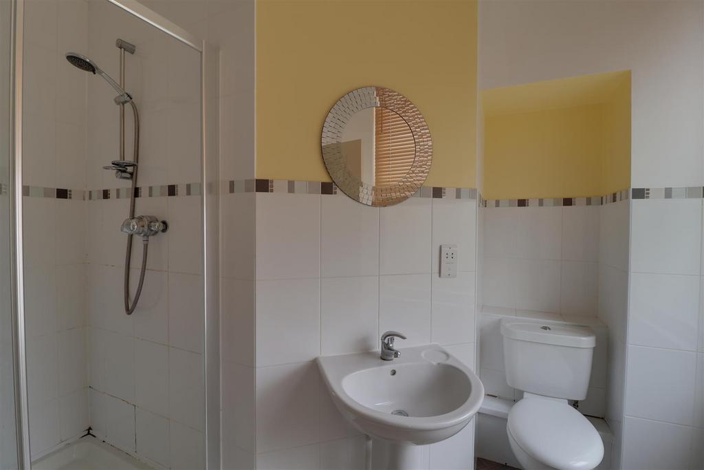 Shower Room - Shower cubicle, wash hand basin, WC, tiled splash backs and tiled flooring.