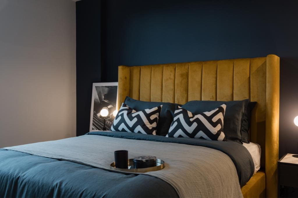 Stylish bedroom including bespoke fitted wardrobes with full height mirror, hanging rail and storage. Ottoman bed with storage, feature headboard and 1,000 individual pocket sprung mattress made from natural materials and marble effect bedside tables.