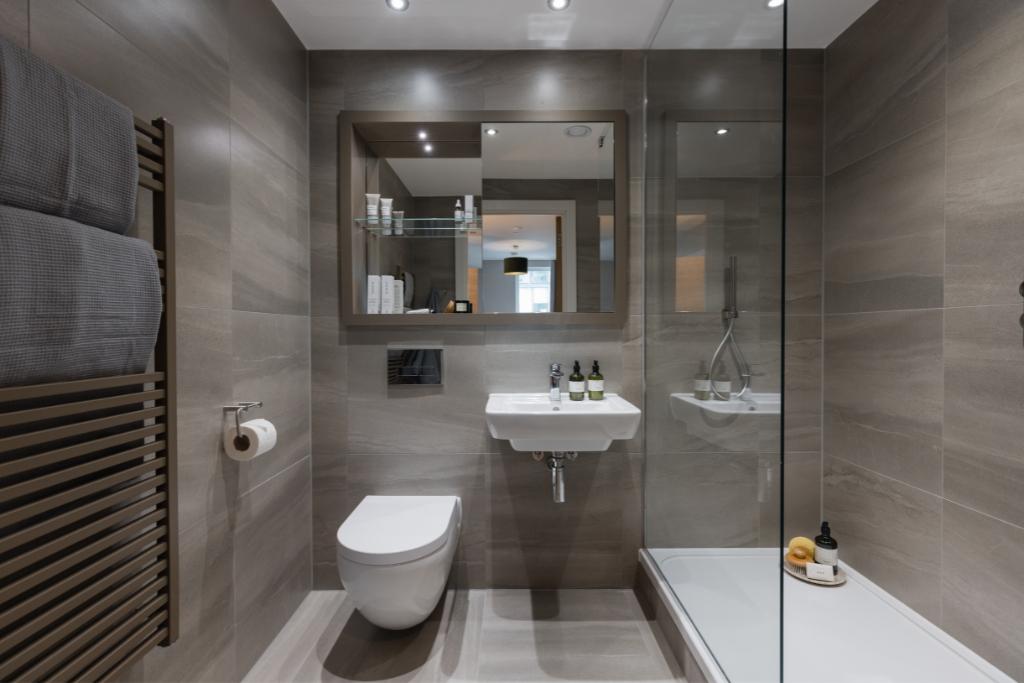 En-suite bathroom with contemporary porcelain tiling throughout. Deluxe sized rainfall shower with separate handheld shower, WC and heated towel rail, plus bespoke vanity cabinet with LED lighting.