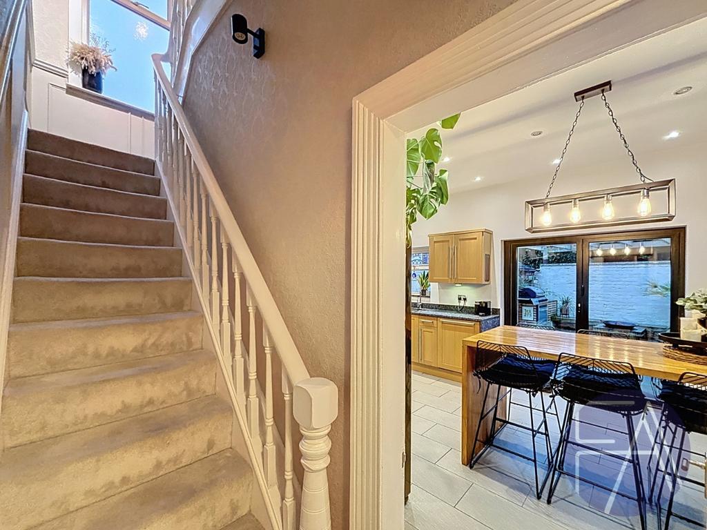 Upon entering, you are greeted by a bright and spacious front lounge, a welcoming area perfect for relaxation and entertaining. The focal point of this inviting room is a charming fireplace, adding warmth and character, making it an ideal space for cosy evenings. The natural light floods through the large bay window, enhancing the airy feel of the entire ground floor.