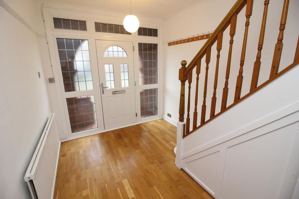 Wood laminate flooring, understairs meter storage cupboard. double radiator.