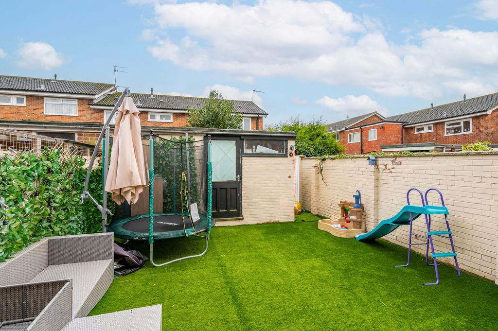 This modernised three-bedroom home offers an immediate sense of quality, with a bright open plan layout that connects the newly fitted kitchen with its integrated appliances, the garden-facing dining area and the lounge with its bay window and feature panelling. Light moves easily through the ground floor, which gives the whole space a relaxed, effortless feel. Upstairs, the bedrooms offer comfortable proportions with useful built-in storage, and the recently upgraded bathroom brings a smart contemporary finish. Outside, the south-facing garden provides an easy-to-maintain setting finished with artificial grass and a fully enclosed design, supported by a brick-built outbuilding with power that adds valuable flexibility. Generous parking for four vehicles sits at the front, and the location within Belton keeps you close to everyday services, well-regarded schools and the village’s green open spaces.