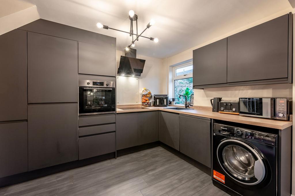 From here you move straight into the kitchen, which has been fully modernised with sleek handleless cabinetry, integrated fridge, integrated freezer, built-in single oven, electric hob with a contemporary extractor, a composite one bowl sink, smooth work surfaces, and generous storage. The room includes plumbing for a washing machine and space for additional appliances, giving you both practicality and style in equal measure. A window above the sink brings in natural light and adds a pleasant outlook while you work.