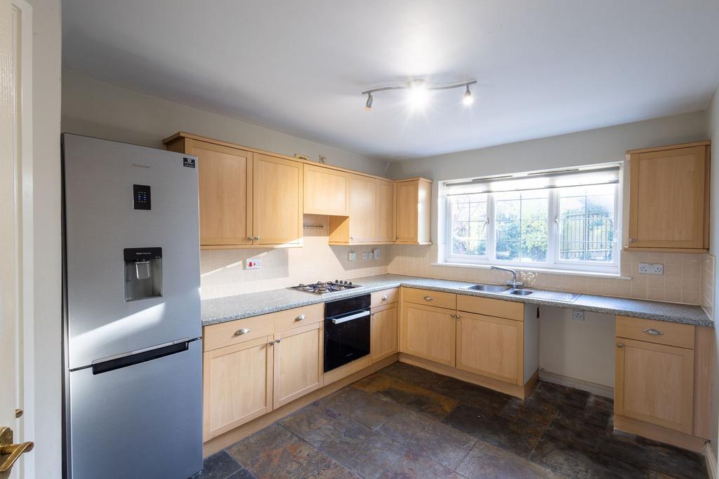 A spacious, well-equipped kitchen with lots of work surface and cupboards for storage. A tiled splashback sits behind the gas hob and electric oven, and a door leads conveniently into the utility room.