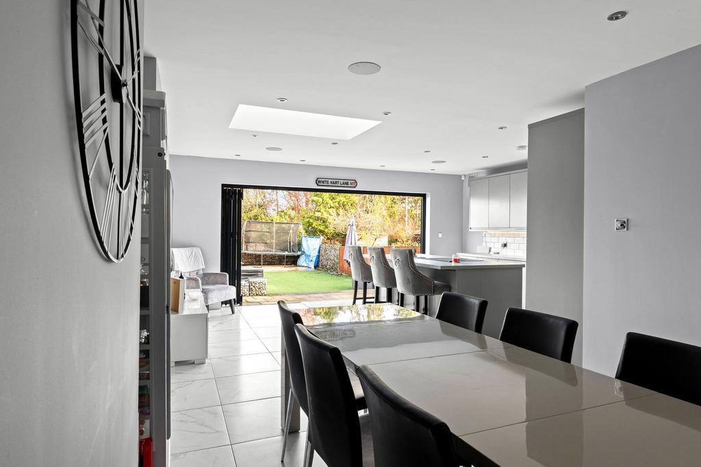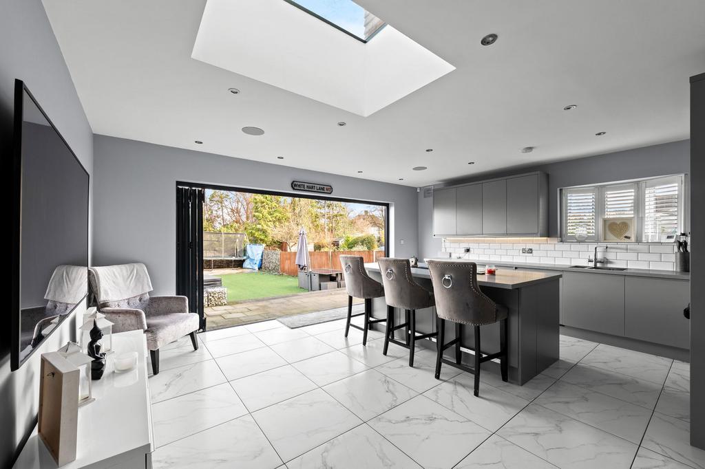 The ground floor is centred around a spectacular open-plan kitchen, dining and breakfast room, measuring an impressive 28’8 x 18’10. Flooded with natural light from overhead skylights and expansive bi-fold doors across the rear, this space seamlessly connects indoor and outdoor living. The sleek handleless kitchen features extensive storage, integrated appliances, stylish worktops and a generous central island with breakfast bar seating, making it perfect for both everyday family life and entertaining.