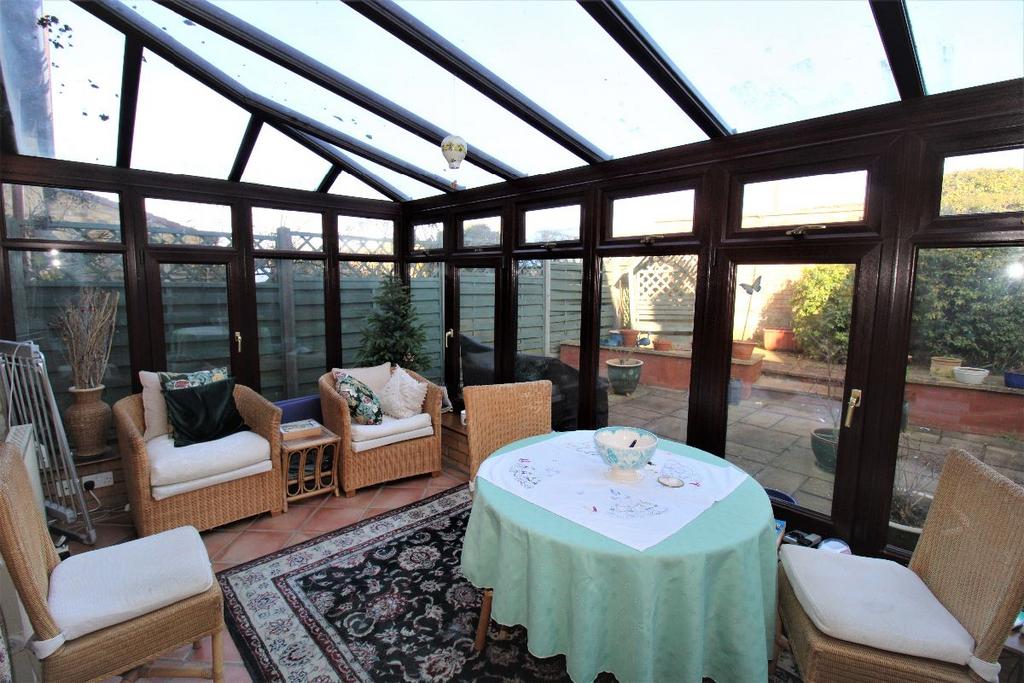 Dark ‘UPVC’ style double glazed construction with solid base. Matching double glazed French doors to rear garden. Tiled floor. TV aerial point. Power and light connected.
