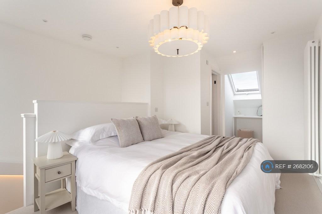 The bedroom exudes luxury with its fitted wardrobes and en-suite bathroom with both a shower enclosure and freestanding bath. The expansive bifold window that floods the space with natural light and boasts rooftop views towards the sea.