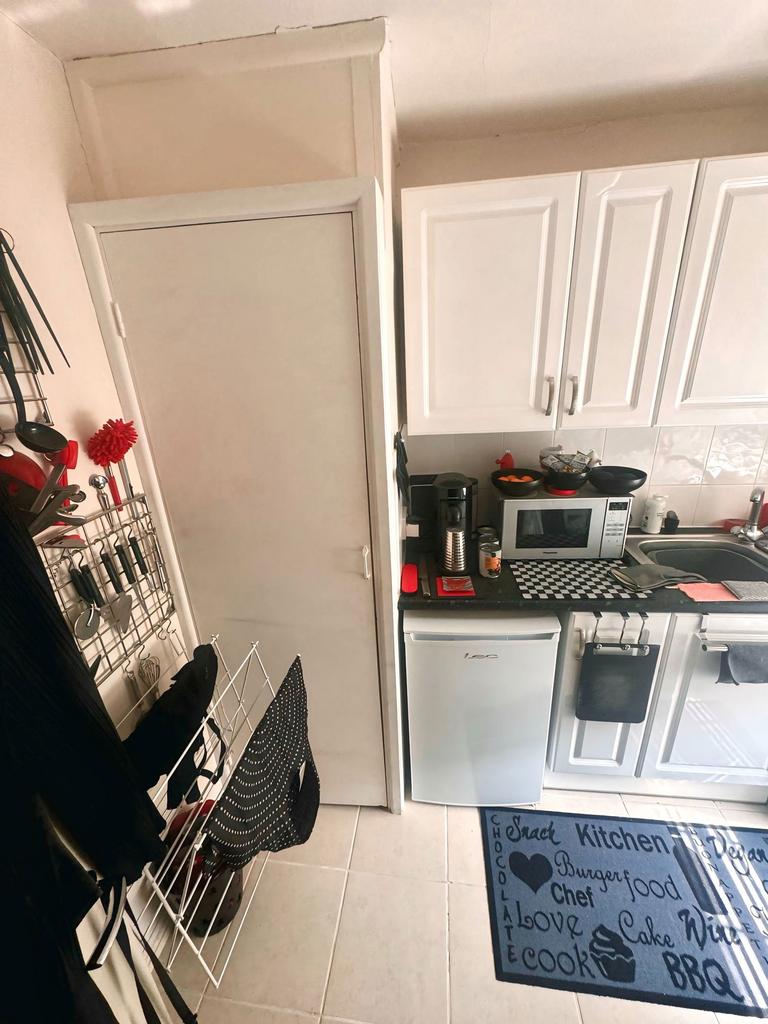 The apartment features a bright, open living and sleeping area, creating a welcoming and airy space filled with natural light. The kitchen is thoughtfully designed as a separate space, offering excellent storage with both upper and lower cabinetry and plenty of work surfaces, providing a practical and functional area for tenants. The modern bathroom is also fully independent, complete with a bath and overhead shower, combining style with everyday convenience.