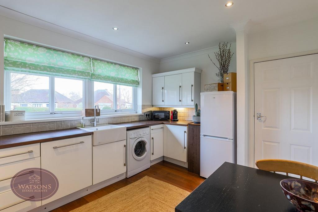 4.08m x 3.23m (13' 5" x 10' 7") A range of matching wall & base units, work surfaces incorporating an inset Belfast sink. Integrated appliances to include: electric oven & 5 ring gas hob and dishwasher. Plumbing for washing machine, ceiling spotlights, radiator, uPVC double glazed window to the front, solid wooden flooring and door to the lounge.