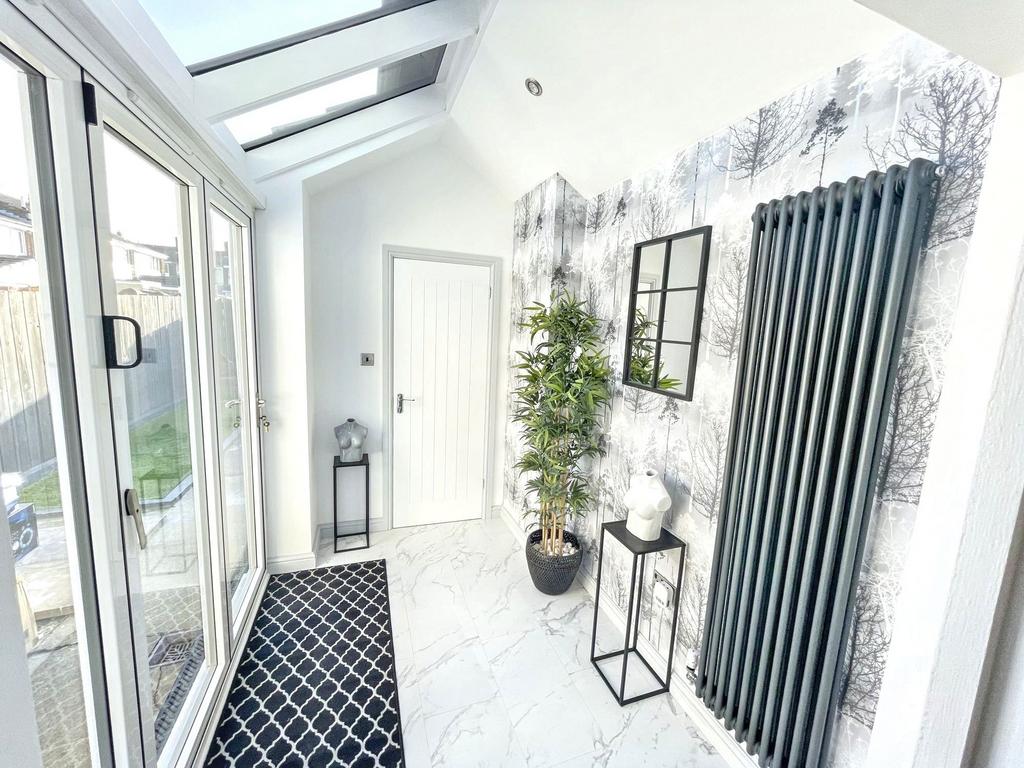 Fitted with a range of wall and base units with high gloss front and low profile work surfaces. Stainless steel sink unit with mixer tap and splash back. Integrated fridge and freezer and plumbed for automatic washing machine. Electric oven and ceramic hob with extractor hood. Double glazed window to the rear. Glazed door to the garden room and stairs to the first floor landing.