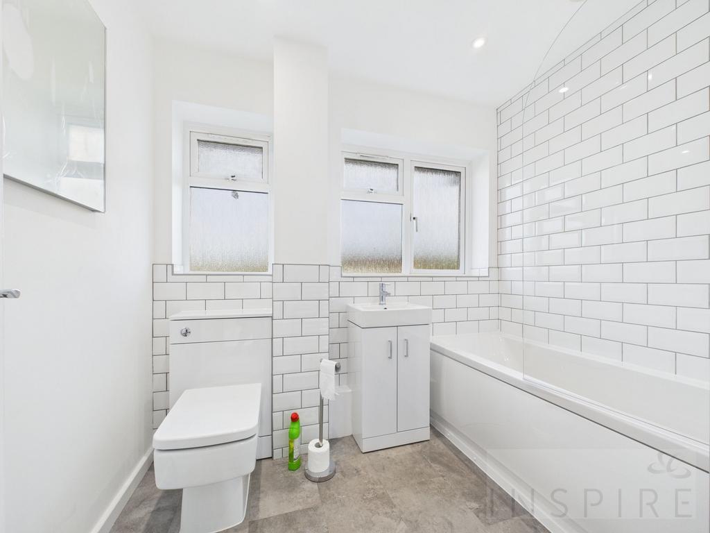 Upstairs, the property offers three well-proportioned bedrooms, each with new carpets and neutral decoration. These rooms are designed to suit a variety of needs, whether as bedrooms, home offices, or guest rooms. The renovated bathroom is finished to a high standard, with contemporary fixtures and fittings including a modern suite and stylish tiling.