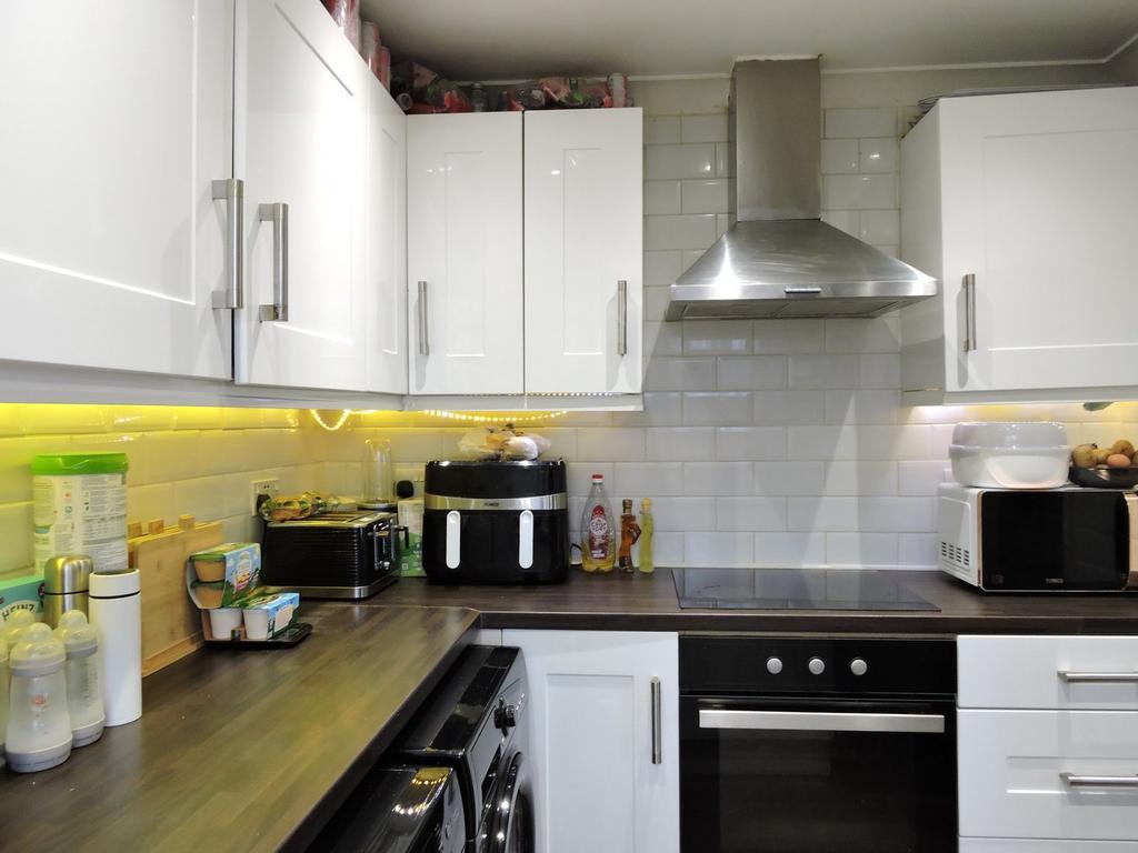 In our opinion nicely fitted modern kitchen units in high Gloss finish with worktop surfaces along with lighting, partly tiled walls, tiled flooring, single stainless steel sink unit with mixer taps, Samsung fitted electric hob with stainless steel extractor hood, electric oven, plumbed for washing machine, spot lighting to celling, coving to ceiling & double glazed window to aspect.