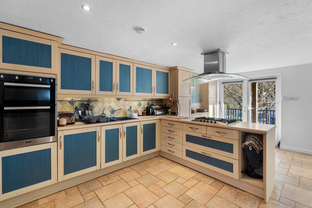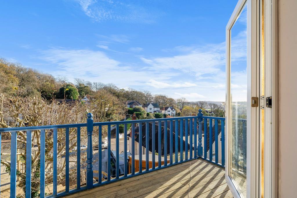 The property features a generously sized kitchen that spans an entire floor, providing plenty of space for those who enjoy cooking or entertaining. On the upper level, you'll find a bright and inviting sitting room with large windows framing the views, along with French doors that open onto a private balcony. The sitting room also includes a central fireplace suitable for an open fire, and leads through to a separate dining area for those who enjoy more formal dining.