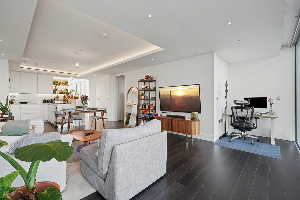 The heart of the home is the open-plan reception room, featuring engineered wood flooring and dual-aspect views that create a spectacular backdrop for dining and entertaining. The state-of-the-art kitchen is finished to the highest specification, complete with white gloss handle-less cabinetry, stone worktops, and integrated Siemens appliances, including double ovens and a dedicated wine cooler.