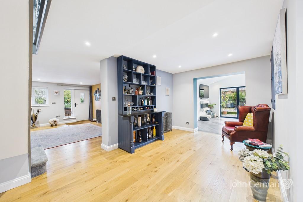 At the heart of the house is a stunning refitted kitchen complete with a large island/breakfast bar and a range of integrated appliances including twin ovens, microwave, warming drawer, fridge/freezer and a navy blue Rayburn adding a character feel. Windows frame views over the garden to the front and side and an open arch leads into an amazing open plan family/garden room with a high ceiling, skylights and bifold doors blending the inside and out. Off this is a bar area and the combination of these rooms makes a great space for entertaining.