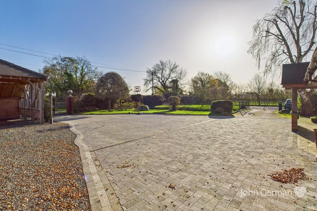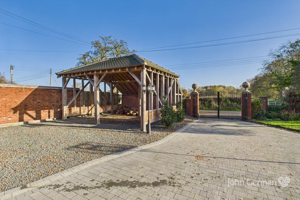 Outside - Double gates open into a large expansive gravel and block paved driveway which provides plenty of parking alongside an impressive open timber car barn and a generous integral double garage, ideal for car enthusiasts. Lying adjacent is a stretch of lawn that has a brook running through it.