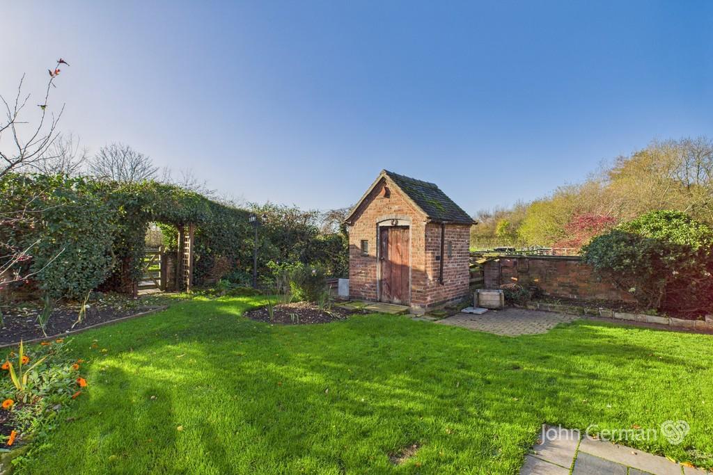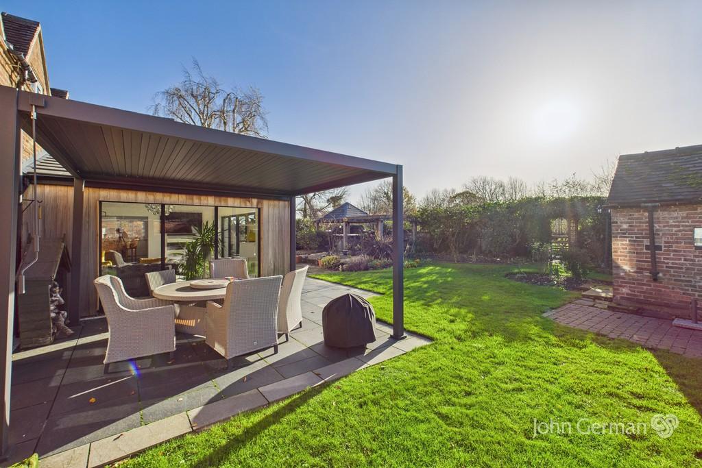 To the rear a patio provides a superb outdoor entertaining area beyond which lies shaped lawns, gravelled and paved seating areas, display borders, a brick outhouse and a pergola.