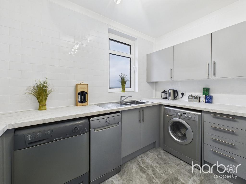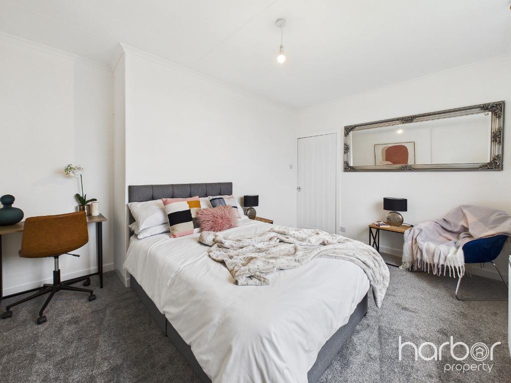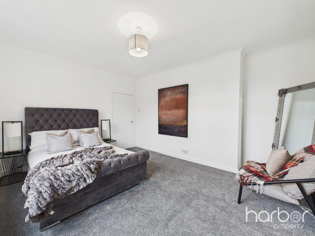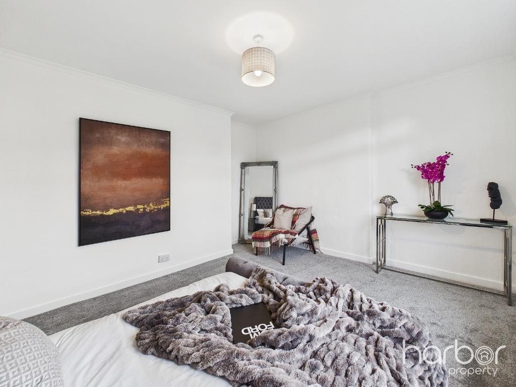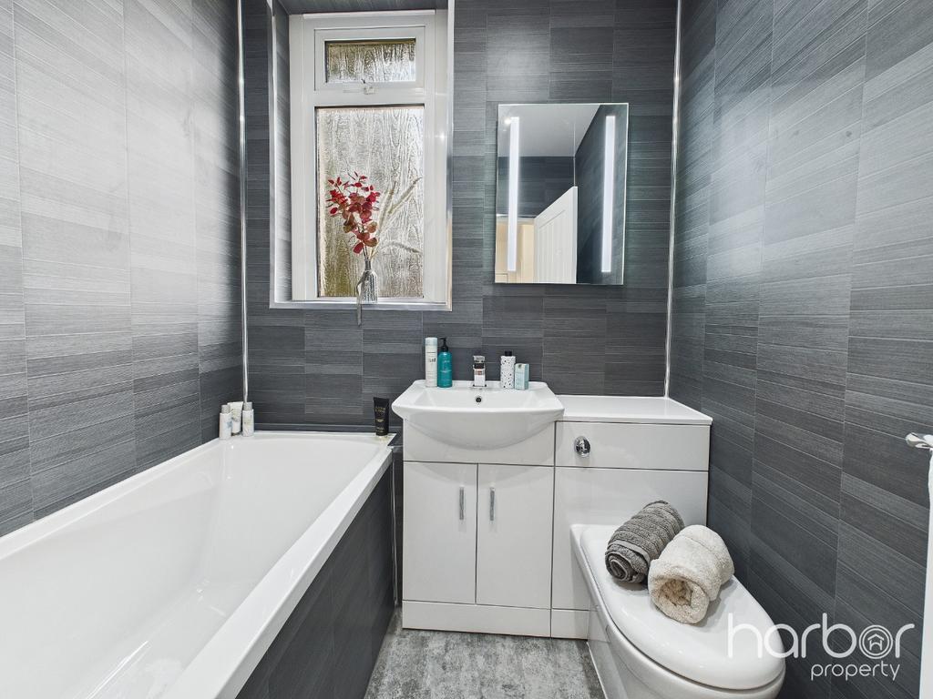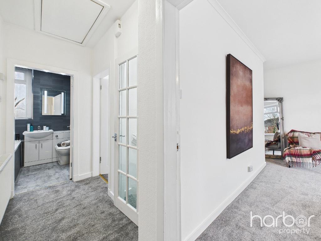 Both bedrooms are generous doubles, each offering flexible space for furnishings. The rear bedroom is a standout feature, boasting stunning elevated views across Bishopbriggs, making it an ideal retreat. The modern bathroom is finished in a clean, neutral style and includes a bath with overhead shower and a combined vanity unit, maximising both comfort and functionality.
