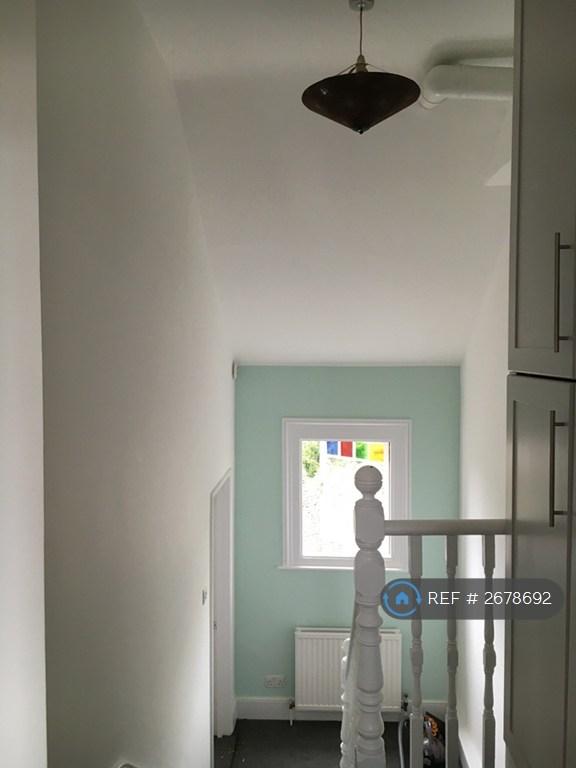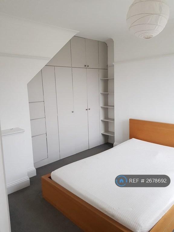 Crouch End N8, Ferme Park Road - lovely, spacious, split-level, top-floor flat in period conversion - with a neutral palette and new windows installed. One double bedroom (with generous storage), living room, separate fitted kitchen, (with washing machine, fridge), bathroom (with bath). The flat is over three levels - bedroom on the first, kitchen and living room on the second and bathroom on the third - so feels very spacious.