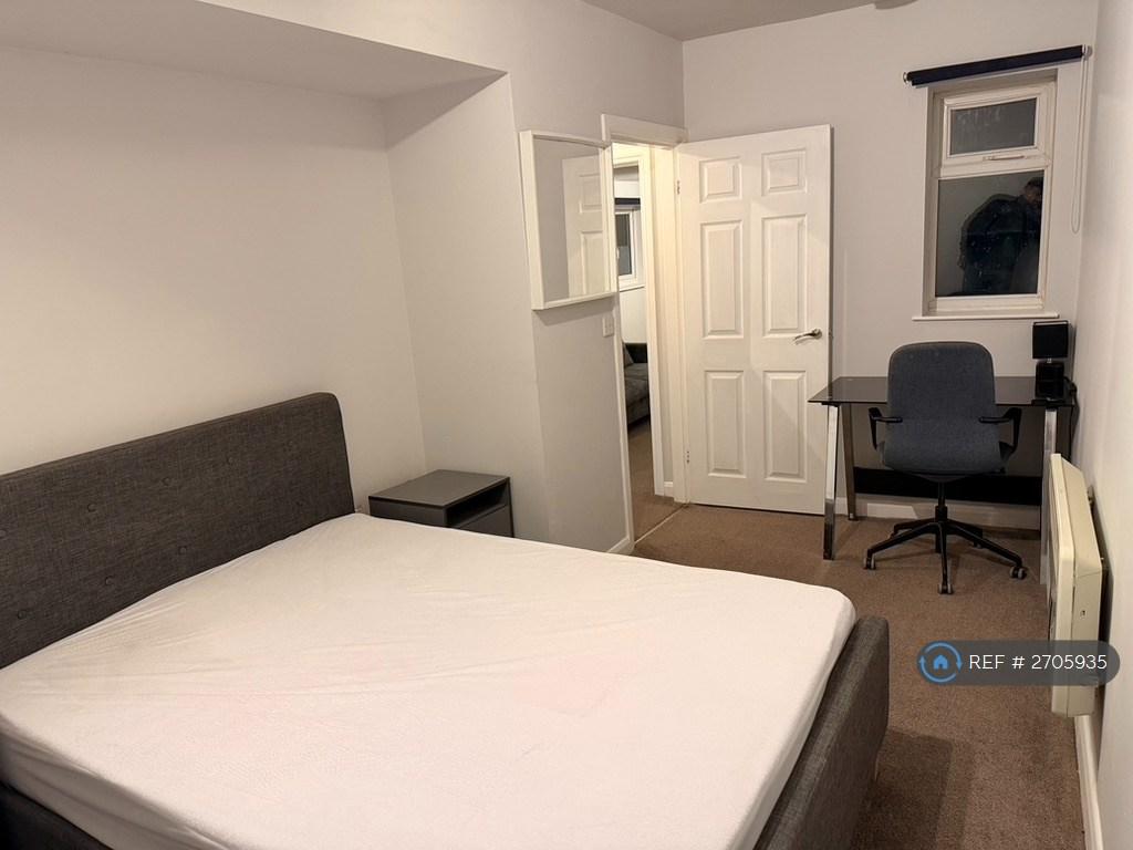 - 1 good-sized bedroom with a double bed, walk-in wardrobe, drawers, bedside table/shelves, and desk with chair.