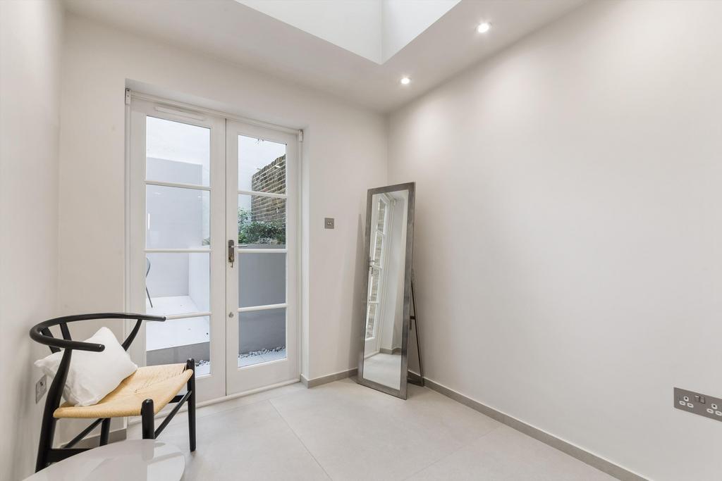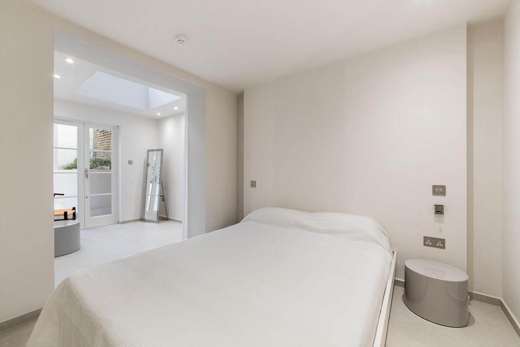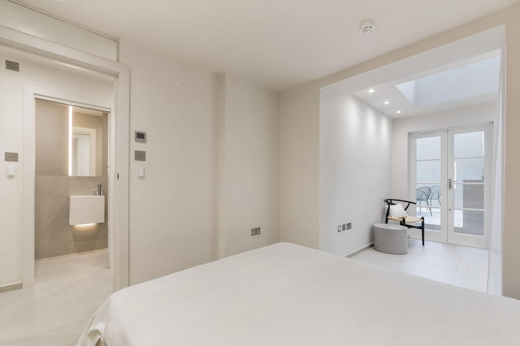 This renovated flat comprises a contemporary finish throughout and is calming, clean, and bright. The open-plan reception room includes a high-specification fully integrated kitchen. The principal bedroom features a large skylight and a large dressing area with an ensuite bathroom. Both bedrooms have access and look onto a private garden via the French doors and the bathrooms are equipped with spacious walk-in showers, demisting mirrors and heated towel rails.