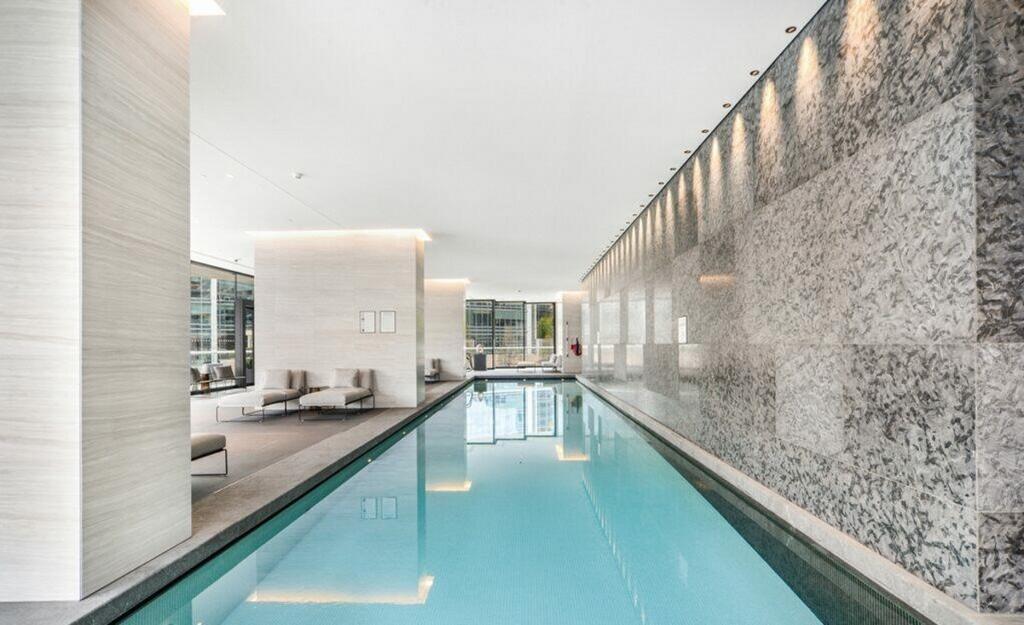 Residents of One Park Drive enjoy access to world-class amenities including a 24-hour concierge, swimming pool, spa, gym, private cinema, library/lounge spaces, co-working areas, and beautifully designed communal spaces throughout the building.