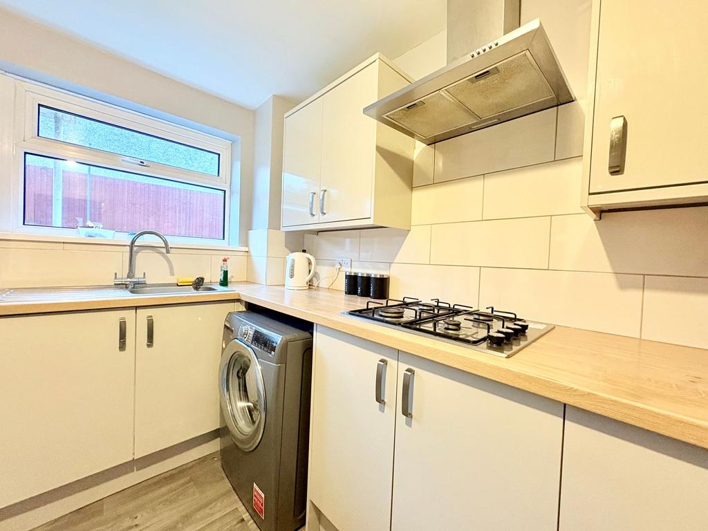 Move through to the contemporary kitchen, where sleek modern units, integrated appliances, and stylish wooden countertops create a truly impressive space. The breakfast bar is ideal for casual dining or morning coffee. A door leads directly from the kitchen out to the private, terraced garden - perfect for summer barbeques, outdoor play, or simply unwinding in your own green oasis. A practical storage shed and convenient side access add extra functionality to the outdoor space.