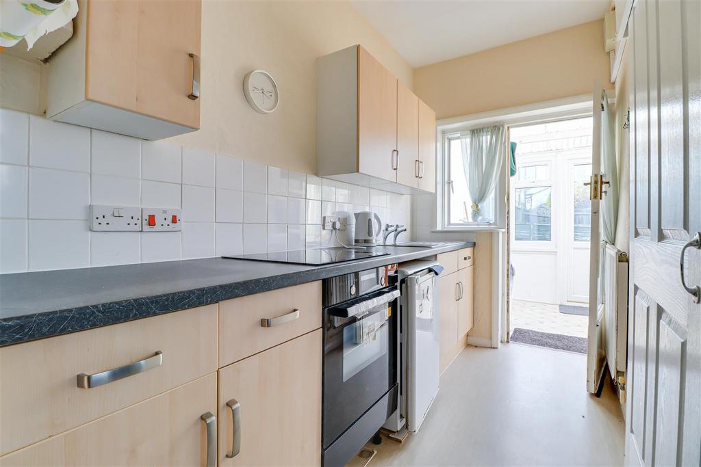 Kitchen - 3.041m x 1.592m (9'11" x 5'2" ) - Glazed window to the rear, wooden door to the rear leading into the conservatory. Kitchen comprising of; wall and base level units with a roll edge laminate worktop, newly installed four-ring electric hob, newly installed oven and grill, stainless steel sink and drainer, space for a fridge freezer, tiled splashbacks, lino flooring, sliding door to: