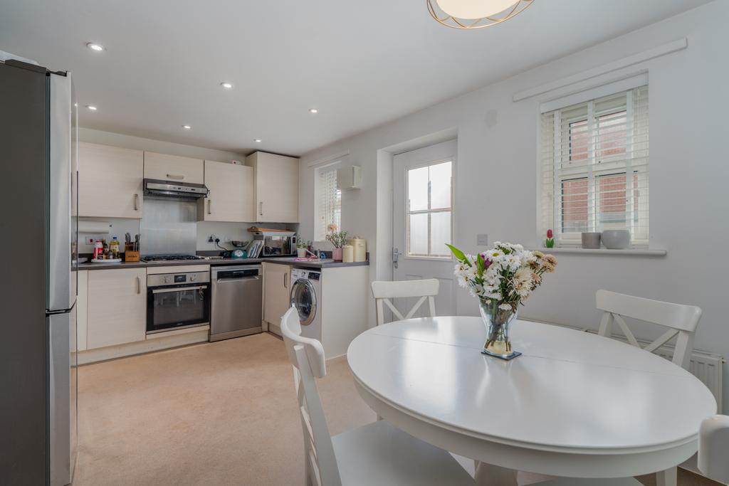 Dual aspect room with double gazed windows to rear and side. Composite back door with glazing leads to back garden. Vinyl flooring. Full range of matching wall and base units. Built in pantry cupboard. Ample work surfaces. Stainless steel sink and drainer with chrome mixer tap. Space and plumbing for washing machine, dishwasher and fridge freezer. Integrated electric oven. Four point gas burner hob. Stainless steel splash back. Stainless steel extractor hood. One of the wall units houses the logic Combi boiler. Radiator. Inset spot lights. Space for dining table and chairs.