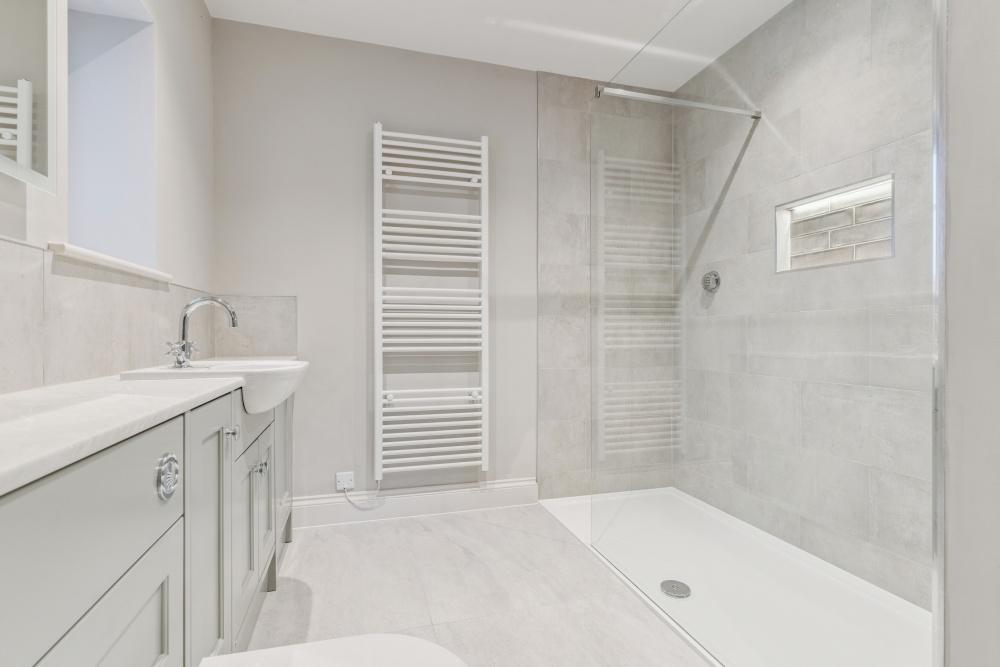 Fitted in a three piece suite comprising close coupled WC with concealed cistern, vanity wash hand basin, storage cupboards with counter tops, wall mounted de-misting mirror, oversized shower enclosure with glazed screen, Aqualisa digital shower, rainfall shower head with handheld attachment, ceramic tiling, shelved recess, thermostat for under floor heating, recessed downlighters, extractor fan, heated towel rail, porcelain tiled flooring, under floor heating.
