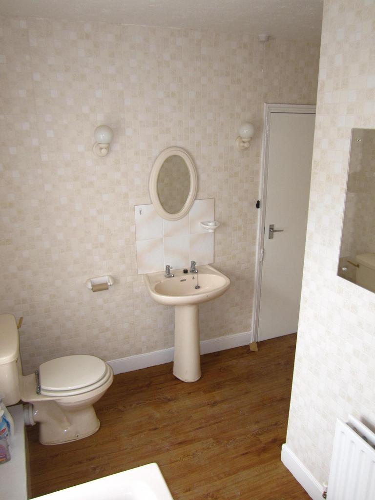 Bathroom – A spacious and light room fitted with pale coloured suite and a shower over the bath. Part tiled walls and vinyl flooring.