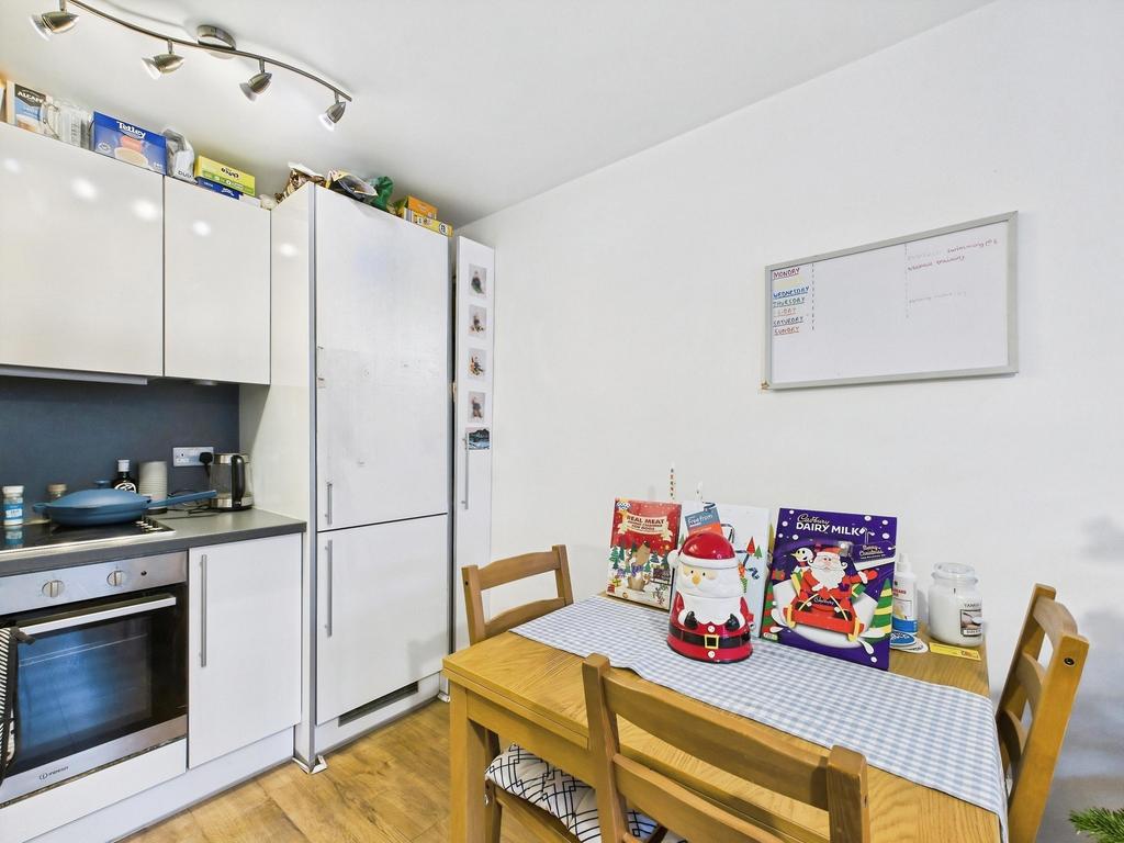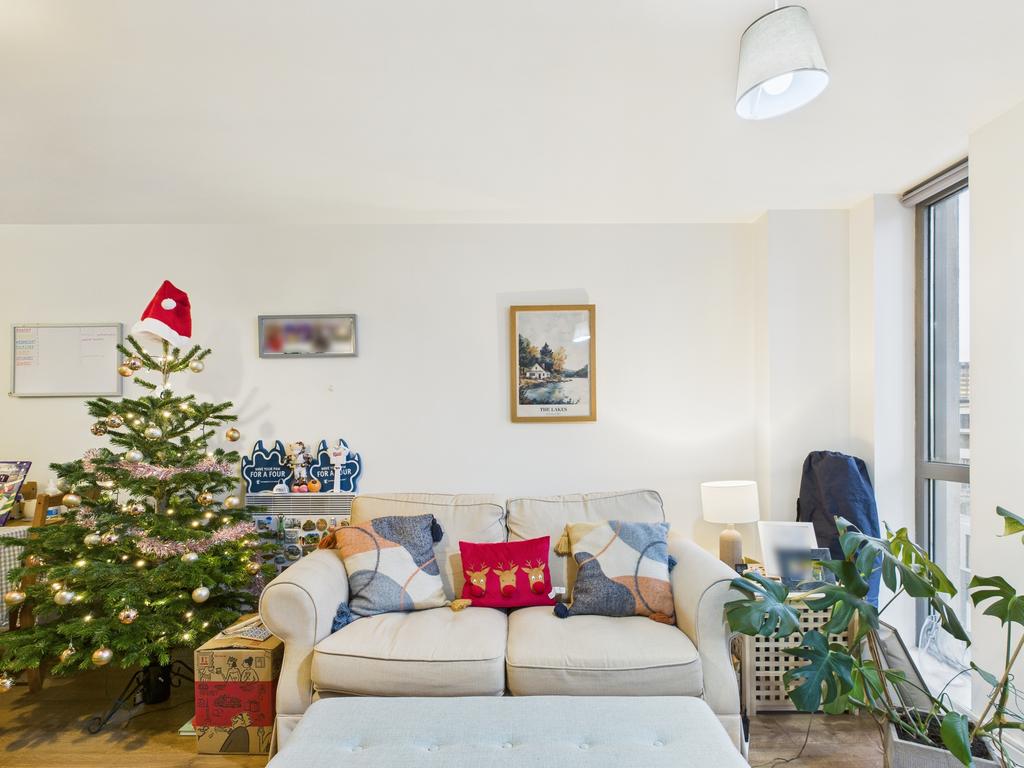 The apartment features an open-plan living and dining area with floor-to-ceiling windows that flood the space with natural light. A modern fitted kitchen, spacious double bedroom, and a sleek bathroom complete the layout, making it ideal for professionals, first-time buyers, or investors.