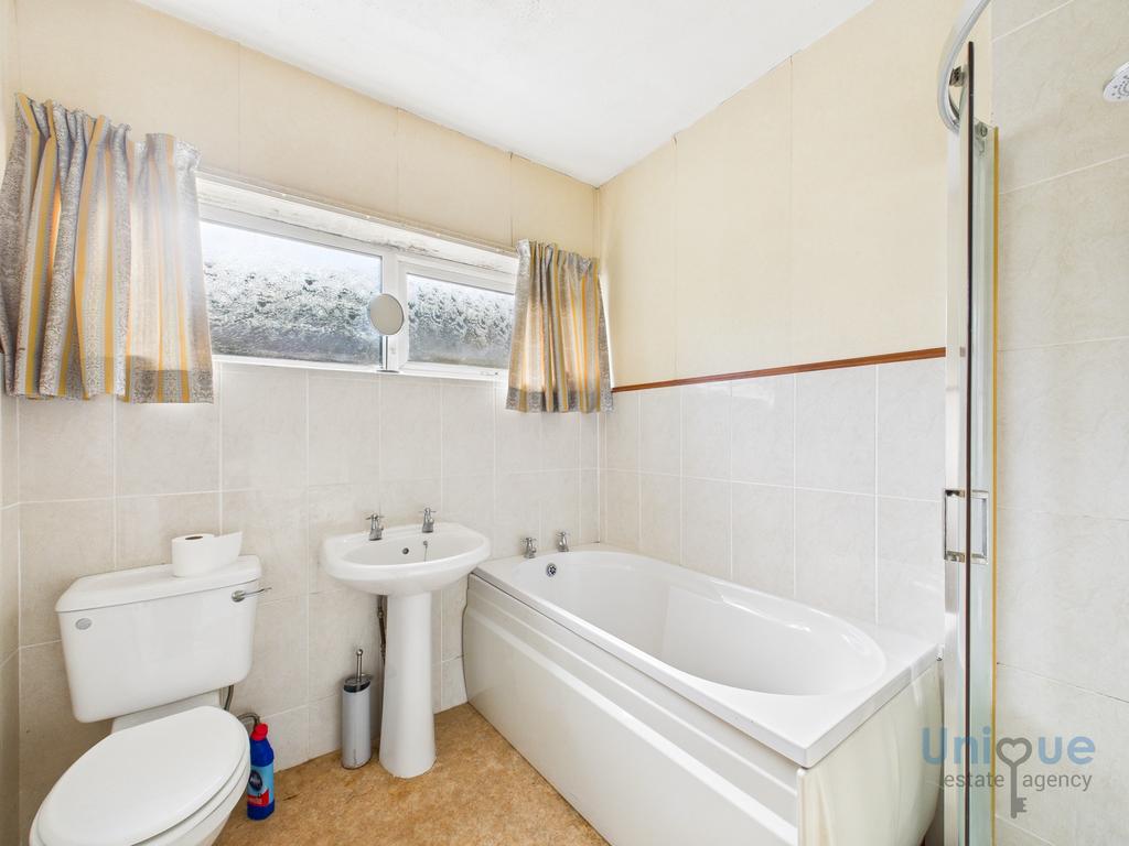 Fitted with a four piece suite including toilet, hand wash basin, bath and corner shower unit.